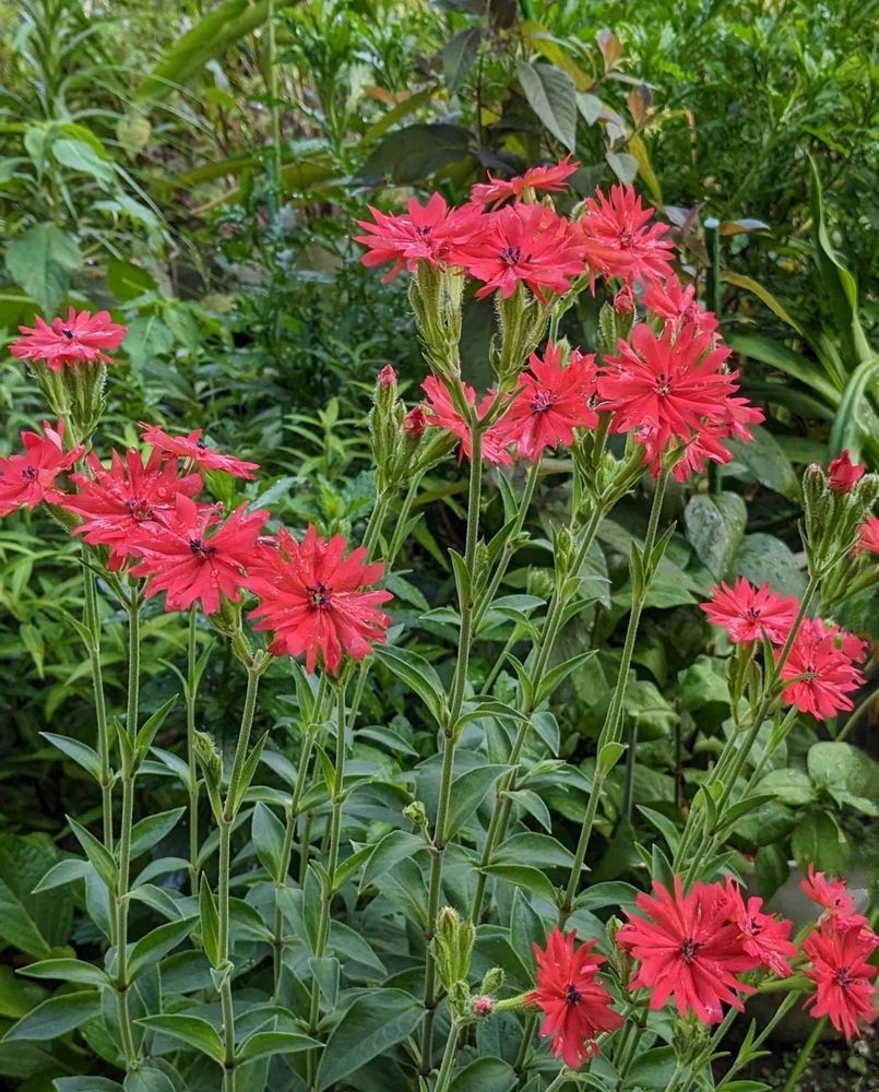 マツモトセンノウ朱色と桃花、フシグロセンノウの順センノウたちがに咲き最後のセンノウゲが咲きはじめました。