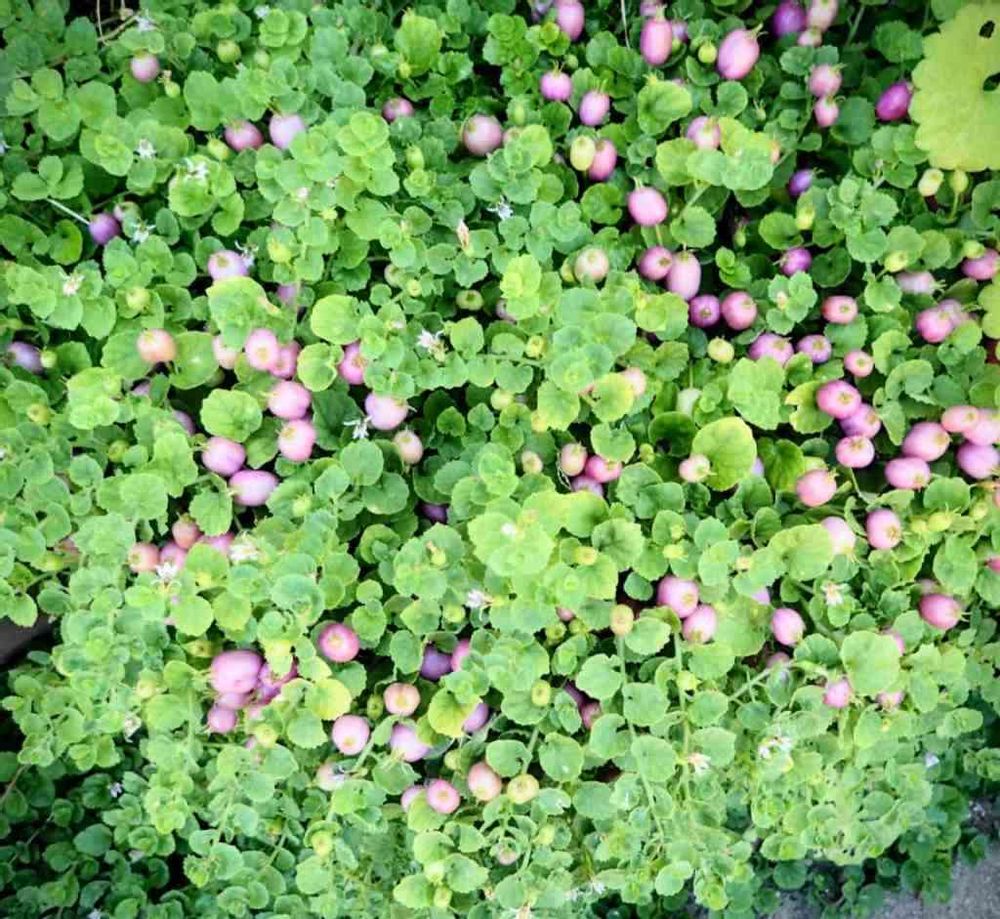 パープルクランベリー(Pratia nummularia)、全体的にはこんな感じです😊35cmの浅い鉢に春にポット苗を3株植えましたが、一株は何故か根付かずすぐに枯れてしまい、残った2株がこんなに育って鉢を覆い隠しさらに外にまで広がっています😲