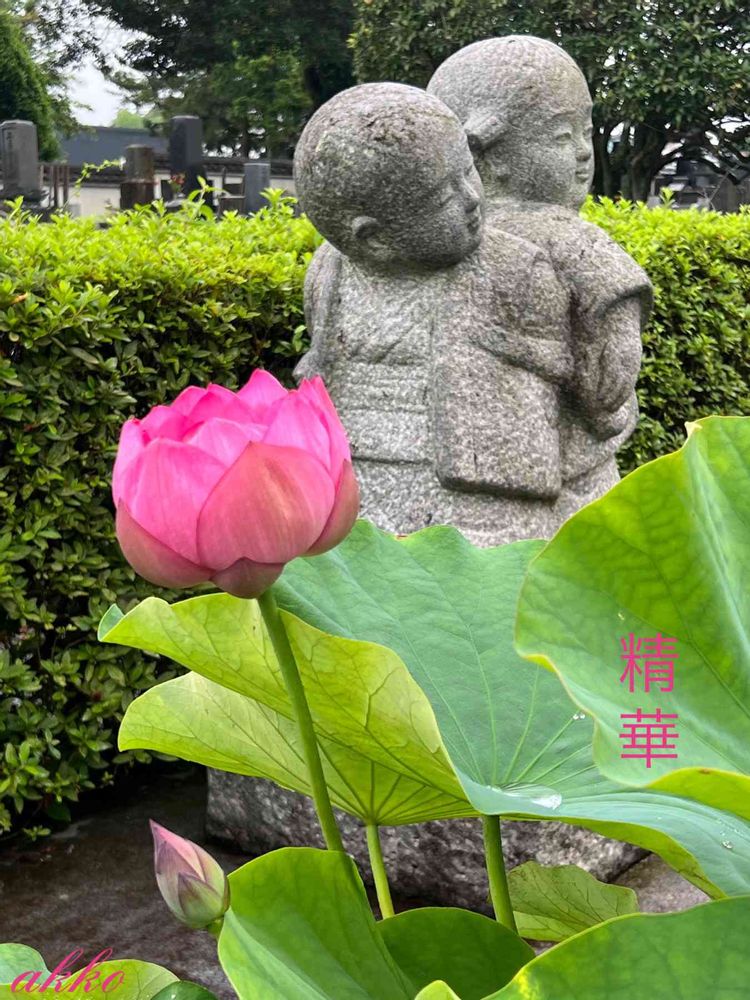 お寺の境内の今朝の🪷 精華と仲良しこよしの石像です