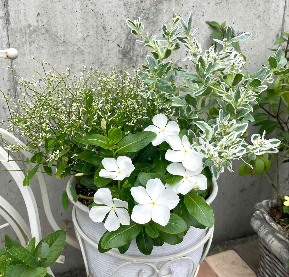 「初雪草」に一目惚れして、お一人様で育てていた「PWユーフォルビアダイヤモンドフロスト」と一緒にしたくなり、お花も欲しいよね!ということで「日々草」も仲間に入りました❣️ 白い寄せ植えです😊