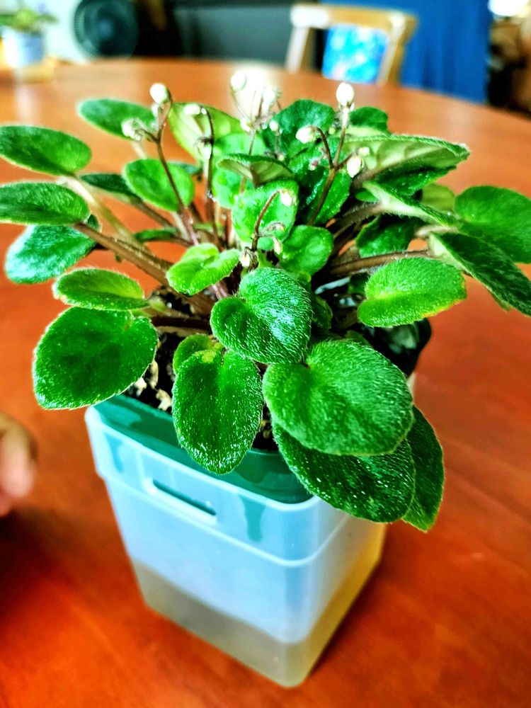 ミニセントポーリアのトレイル種、フェアリーファウンテンが大きくなってきたので植え替えしました。小さいスリット鉢が水受け容器にピッタリサイズ✨