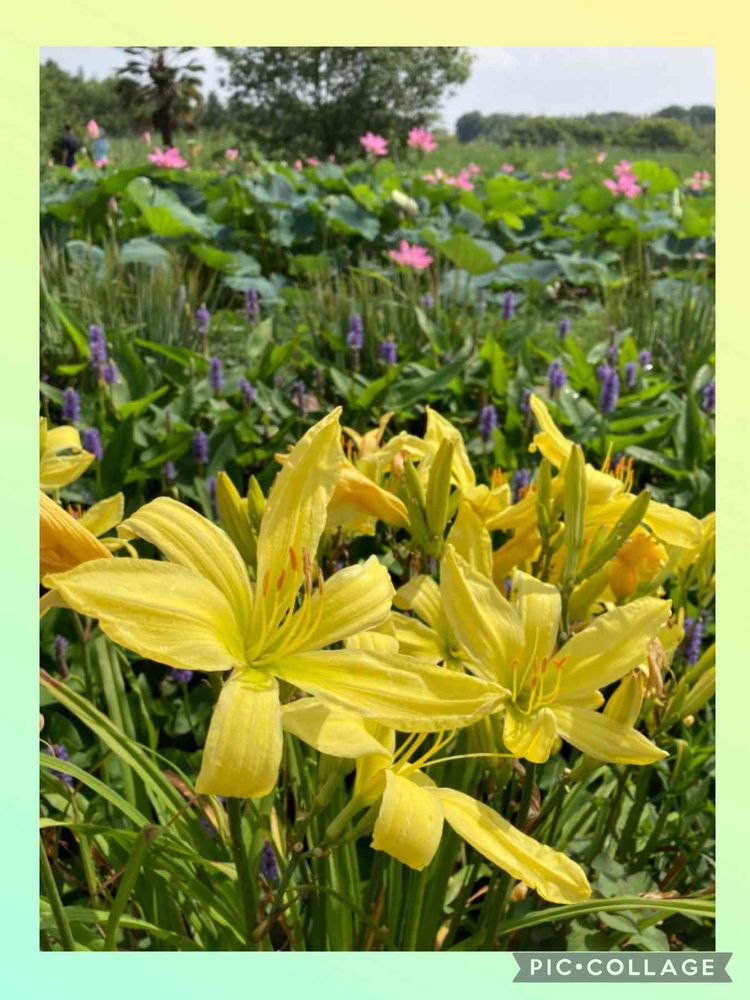 後ろにむらさきのポンテデリア、ピンクの蓮、一枚の絵のようでした♡