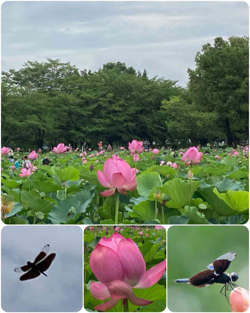 沢山咲いた古代蓮のお花を見てまわり、原っぱからも写真を撮っていると、とても珍しいチョウトンボさんが次から次へとやってきて、私達の頭上を回るように、ヒラヒラと舞ってくれました‼️