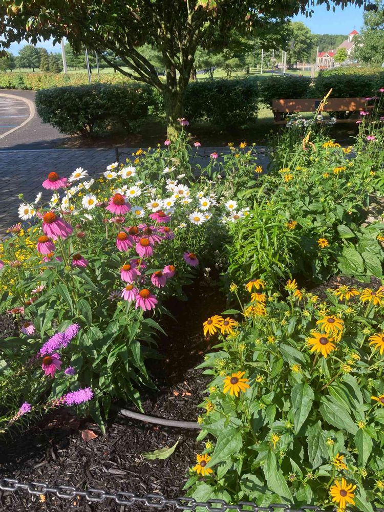 いつも出かける公園の花壇にて。Daisies, Blacked eye Susan and purple coneflowers. どれも多年草で、毎年見られるのが嬉しいです。今朝までの雷雨のためか瑞々しいです。