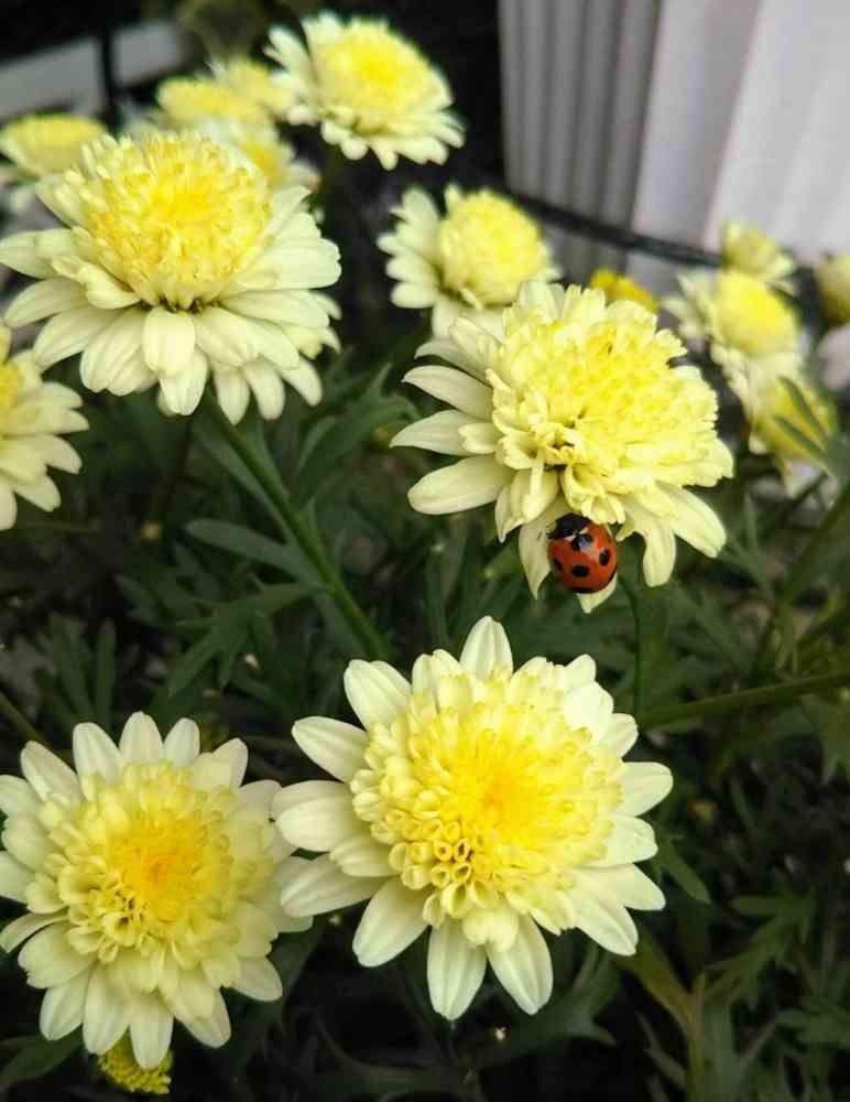 レモンイエローのマーガレットまたまたかわいいですね~(*´`)♡ そこに ちょこんと赤いてんとう虫 本当に絵になります🌼🌼🐞