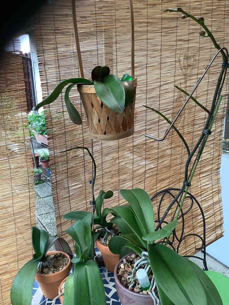 胡蝶蘭集合 若い頃は貰っても翌年からは咲いた事なくてトラウマになってた蘭 今年はGS友さんのアドバイスで花芽が出来て嬉しい😆❣️ 右は室内育ちを外に出したらどんどん元気になり花芽もあちこちから出てきました 感激💕 蘭々さんありがとう