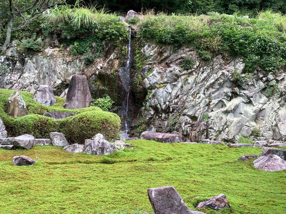 書院西側には、自然を活かした岩盤で岩肌を伝って落ちる滝水、その前に広がる緑鮮やかな苔庭庭園の涼やかな光景が先日TVで観た通りでした💚