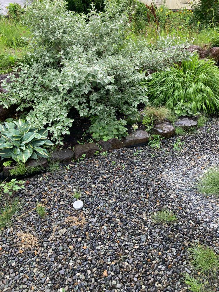 写真の場所では、シマグミくんと日当たりが少し苦手な子分たち、というコンセプトで 植栽を考えています。
