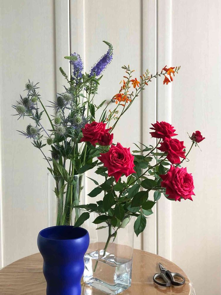 ベランダで咲いた赤バラを主役に、ブルーの花瓶に活けます。