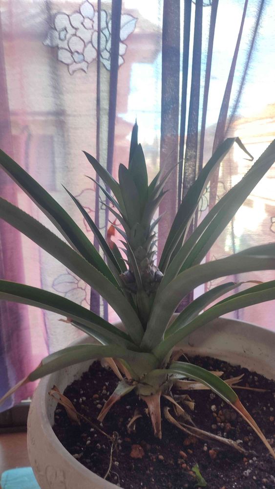 部屋の中でも枯れずに、大きくなりました。パイナップルがバルタン星人が隠れているように見えます。