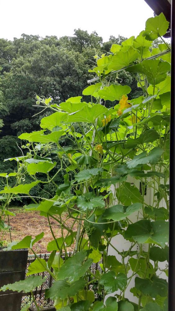 狭い 畑 なのでかぼちゃ蔓を地面に這わせることはできません。やむなく背の高い柵に這わせました。