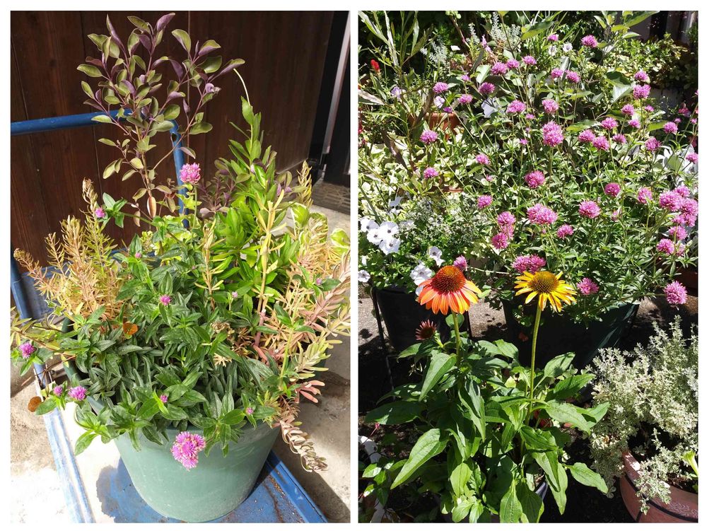 夏のお花、コンフレナ.ラブラブラブのビフォー(6月9日に植込み)と向かって右はアフターです。