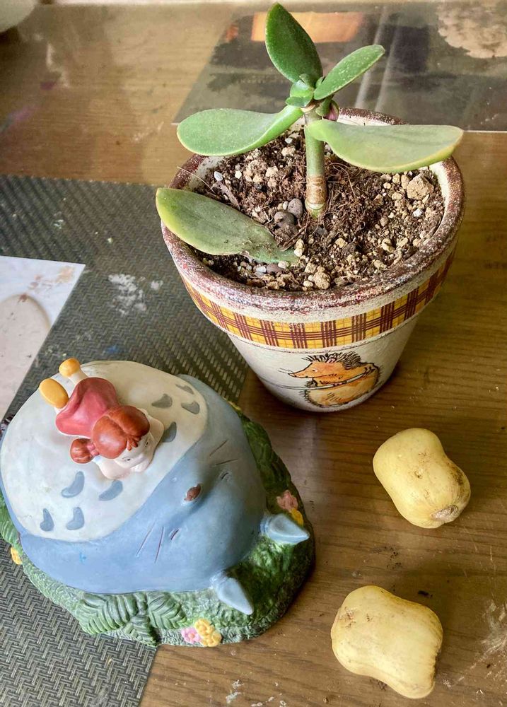 なつ子さんに頂いた多肉ちゃん、新芽が出て喜んだけどなんだか元気がなくて、今朝1枚葉が落ちてしまいました‼️場所を移したのがいけなかったのでしょうか⁉️それから手前の右の丸いの2個、皇帝ダリアの下にありましたが、球根なのでしょうか⁉️