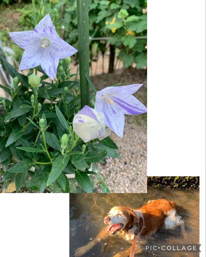 ばあちゃん担当の畑の桔梗が咲きましたが、普通の桔梗じゃないですね😅今日は暑くてカールくん🐕も用水路にドボンです🤣💦