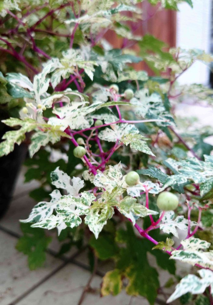 葉がこんなにも美しいのにさらに茎が濃いピンク、実がない時期でもどこをとっても美しい植物だ
