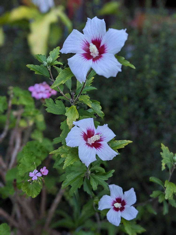 庭ではシンプルな色合いのムクゲ3姉妹〜?満開に🈵