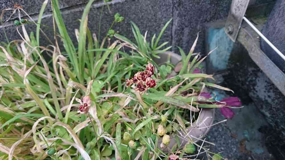 花ではなく種なのですが…ザクロの実を小さく固くしたような印象の種でございました。葉は背景になっているイネ科みたいな雰囲気のやつだと思います。