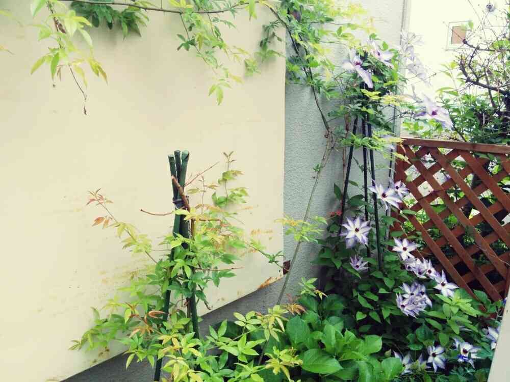 お義母さんの庭、モッコウバラもクレマチスも3年目。やっぱり北海道ではモッコウバラは咲かないのかな?冬が長く寒いため花芽がなかなかつきません、、