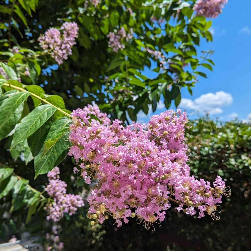 祇園祭の山鉾巡行を見ての帰り、三条大橋の側に咲いていた🩷サルスベリ🩷のお花が青空に映えて美しかったです😍💖