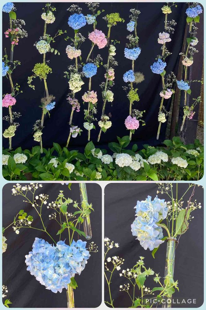 最初は紫陽花のドライフラワーを吊ってるのかと思いきや、水が入った細長い花器を紐で吊るして、長く繋げていました🌸🌿🌸🌿🌸
