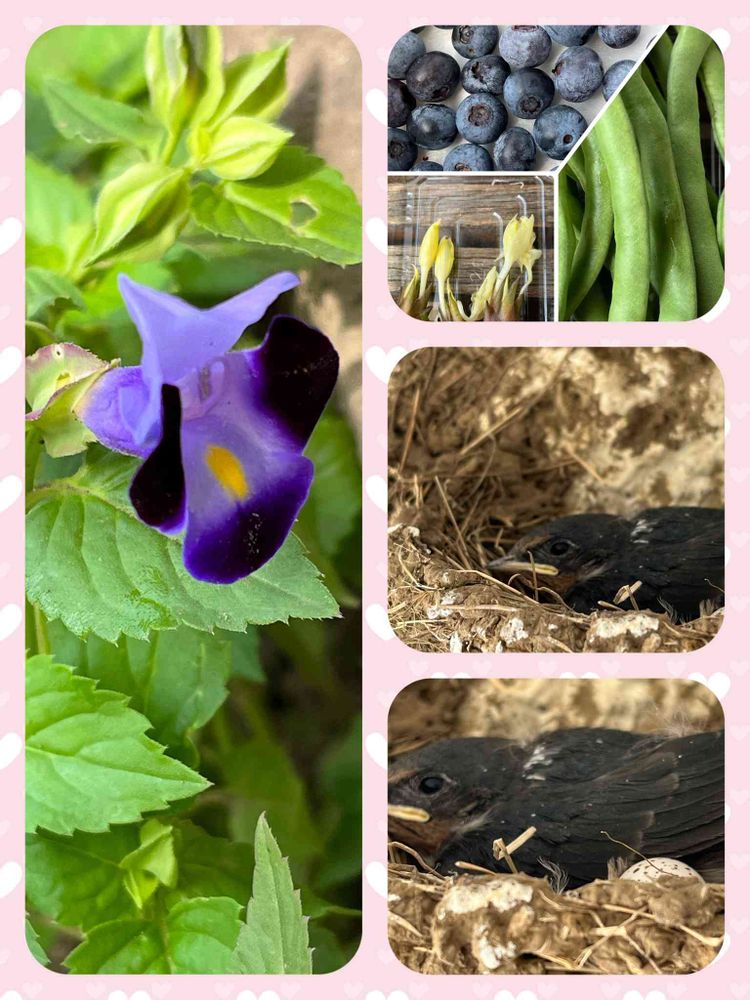 おはようございます。薄曇り、31.5℃、9:40ムシッと暑い。今年もトレニアが庭のあちこちで咲き始めました。今日の収穫はブルーベリー、ミョウガ、インゲンでした。玄関先のツバメさん、大きい赤ちゃんが1羽、卵が1個しか確認できませんでした。7月6日に1羽目が孵っていたので13日間も開いているので無精卵かもしれません。😻😍🥰☺️😸😋