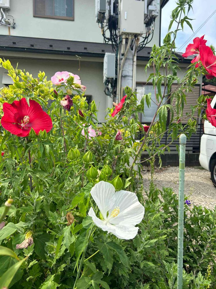 白いタイタンビカス、エルフも咲き始めました。タイタンビカスと西洋芙蓉が満開です。赤い花も盛夏にふさわしいですが、白い花を見ると少し涼しくなりますね。