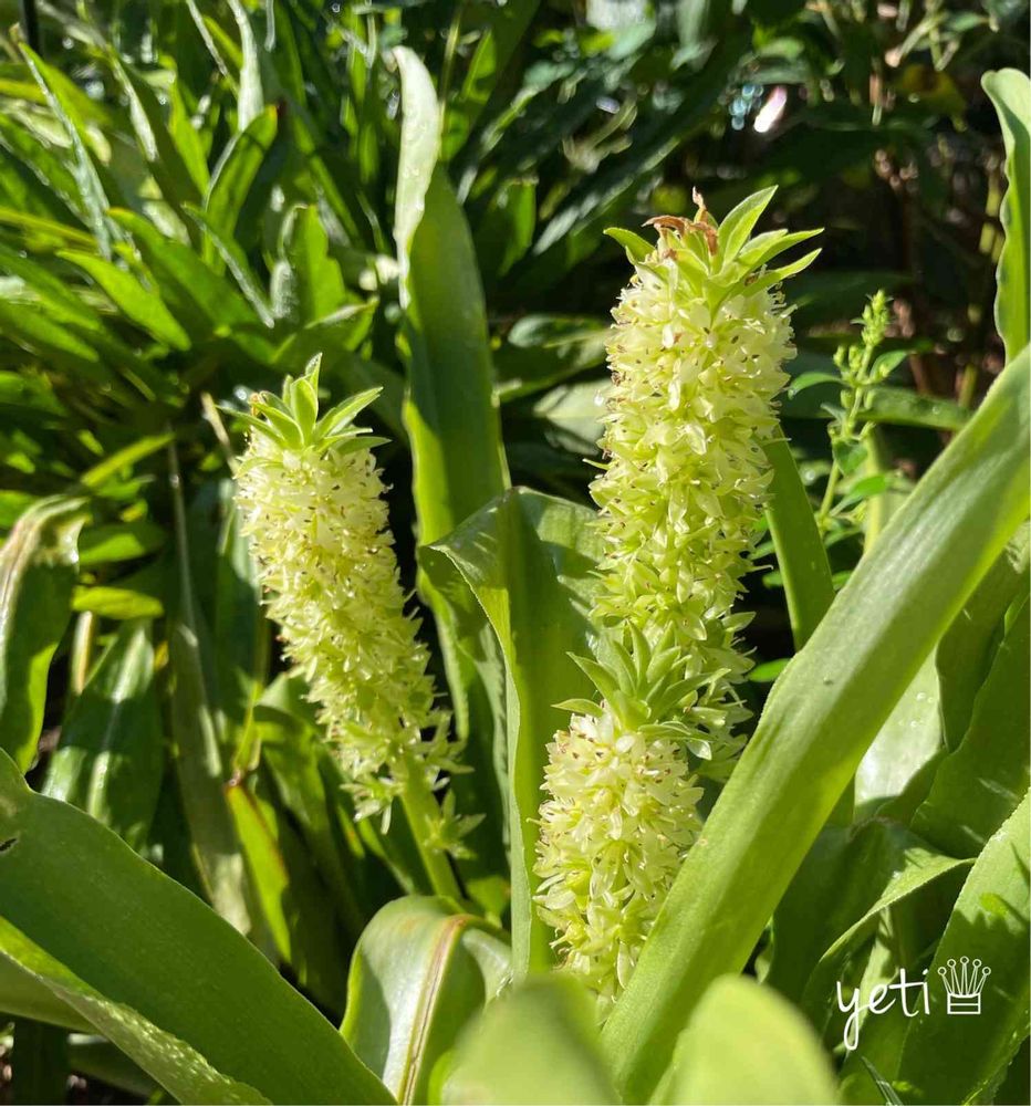 毎日暑いですがいかがお過ごしでしょうか☀️ユーコミス(パイナップルリリー)が咲いています。お花も緑っぽいのであんまり目立たなくって、最近咲いてることに気づきました😅