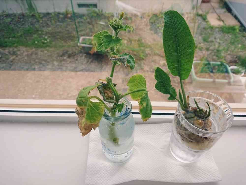 水耕栽培している植物たち。なんと折れてしまったきゅうりも水耕栽培できちゃいました。さらに育った後地面に植えようと思います