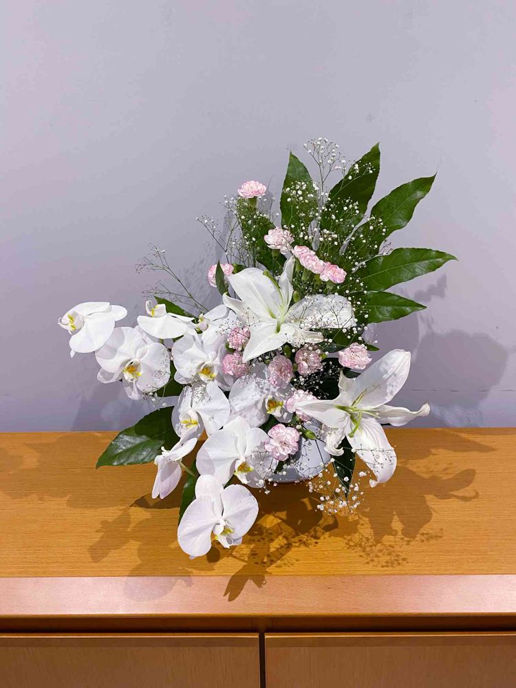 白を基調とした胡蝶蘭とオリエンタルリリー。