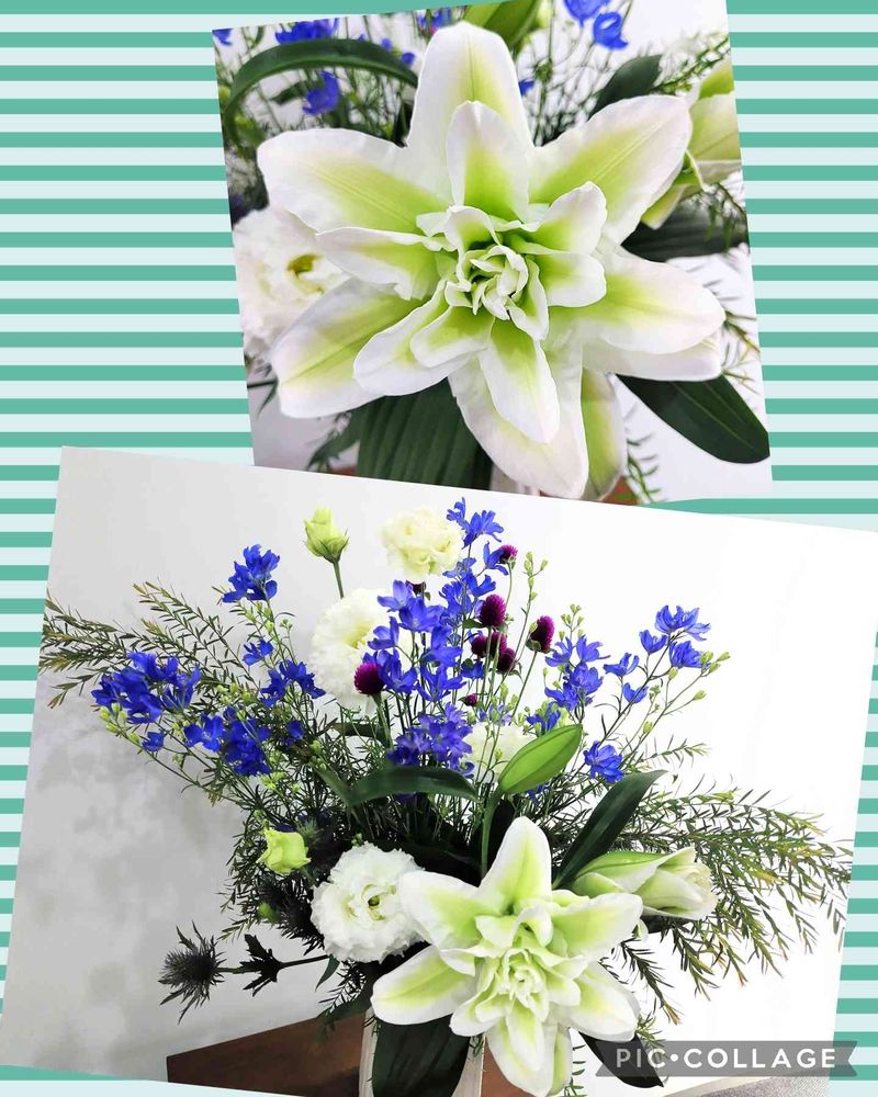 今週の花材は、トルコキキョウ、メラリューカ、エレンジューム、八重咲き百合、千日紅、デルフィニウム、です✨