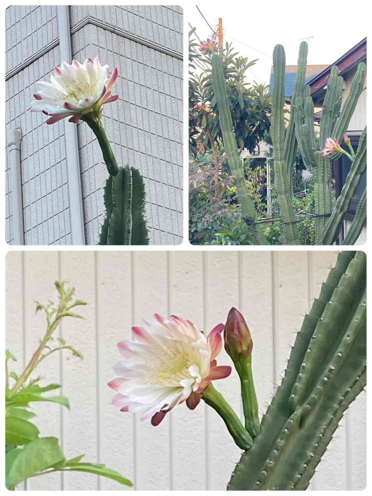 ご近所さん家の「柱サボテン(鬼面角)」の花がまた咲いてくれた。