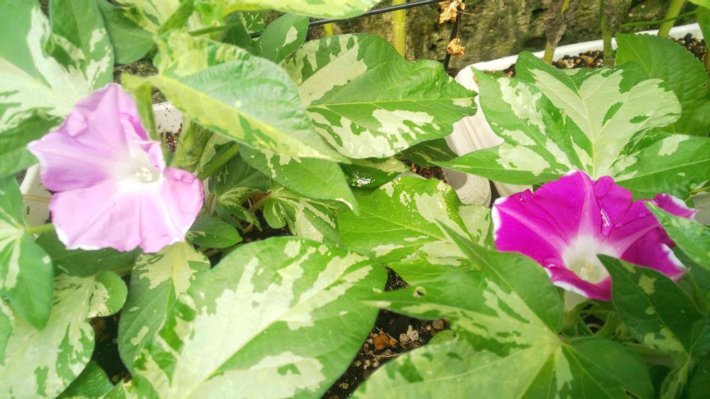 ダイソーのつるが伸びない朝顔、ポツポツ咲き始めた!