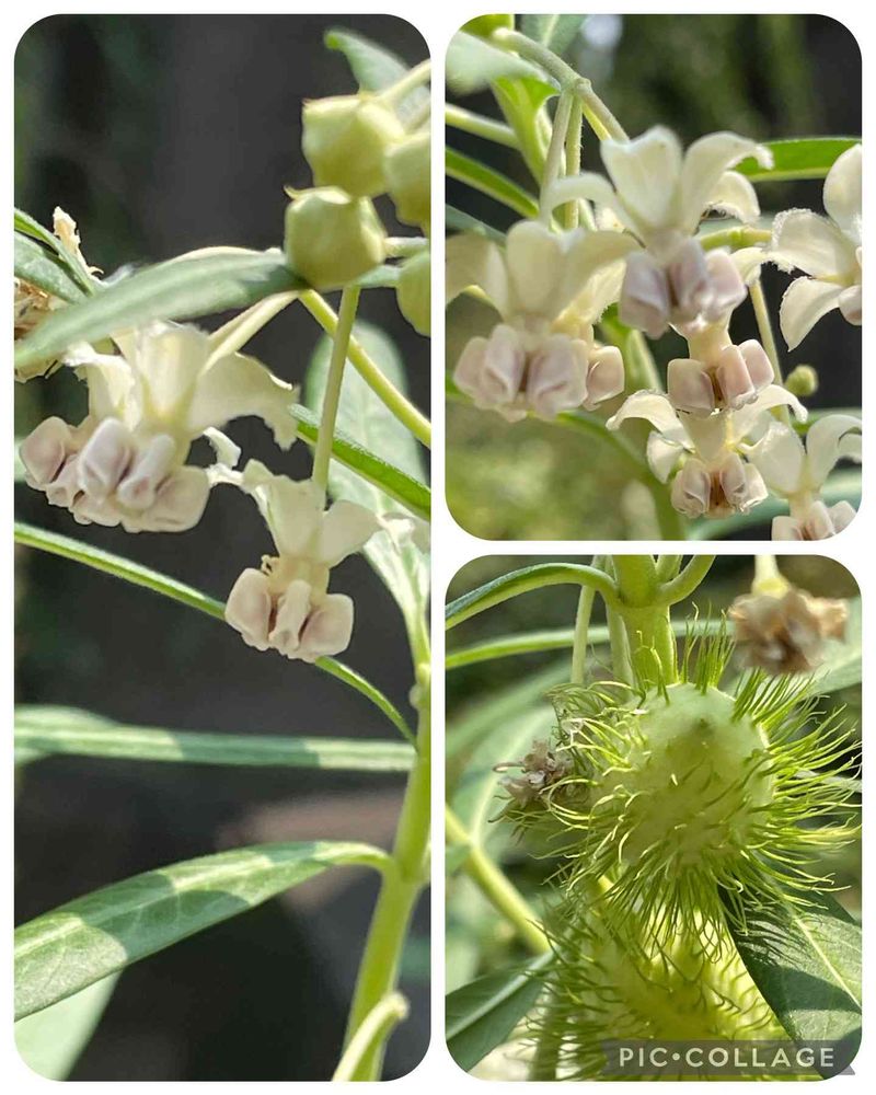 乳白色の小さな花、何個かトゲのある風船状の実もつけていました。