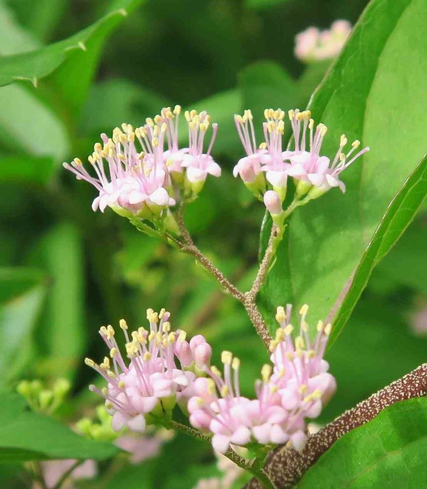 雑草の緑の中にピンクの小さな花が咲き始め、