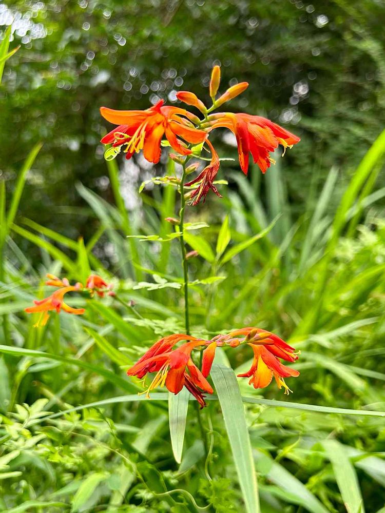 花の少ない酷暑下の庭園の貴重な差し色🧡。園内開花中マップには載っていなかったなぁ。カニクサ🌿に巻きつかれて頑張っているのにな・・・