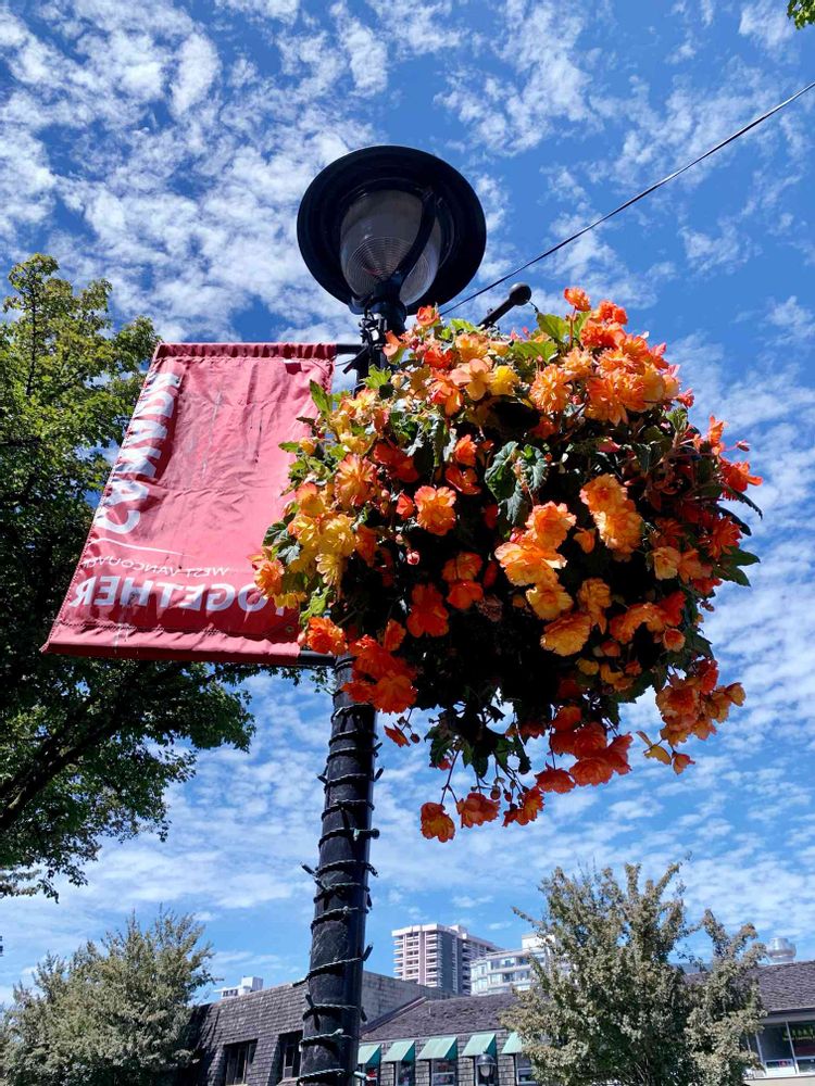 🧡Street lamp post with beautiful Begonia under summer sky💙