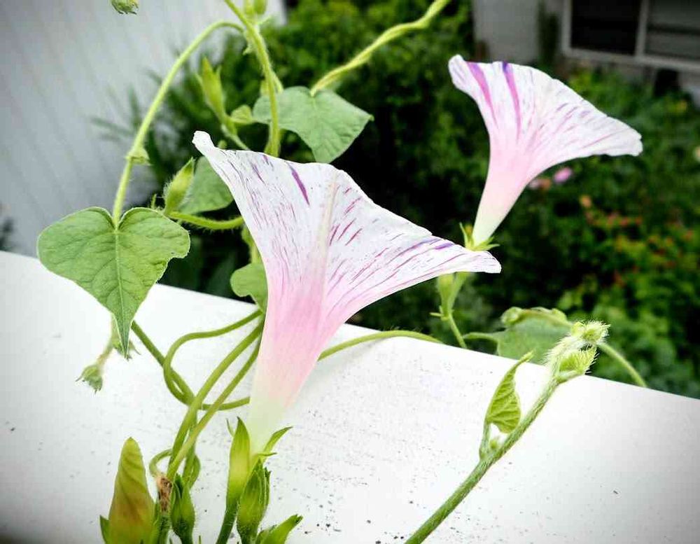 今年も咲きました、落ち生えの西洋朝顔です~白地に紫の縞と花筒はピンクに染まる可愛い花です😊💙😍💜😍🤍😍💕😍