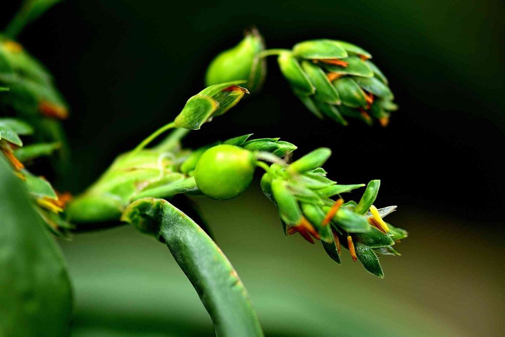 ●苞葉鞘(ほうようしょう)というツボの中に雌しべがあり、その先に雄しべが垂れ下がる。苞葉鞘とは花びらの元の部分に付いている葉が変形した部分のことで、ジュズダマの場合これが実となる。