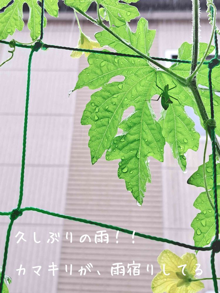 カマキリは、どこへ居るのかなと思ったら雨宿りしてた😁