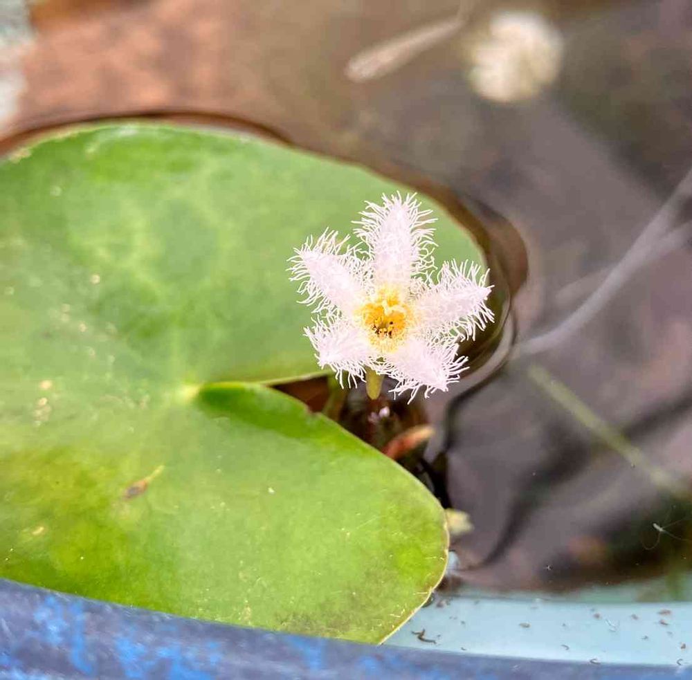 浮いてるハートの葉っぱ一枚から小花が立ち上がり1つずつ咲きます。