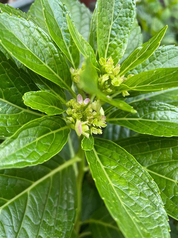 今年5月に仲間入りして花が終わったから剪定したのに花芽が上がり色付いてキタ〜ダンスパーティハッピーさん購入時は青色だったから青アジサイの肥料を使ったのにうっすらピンク?何故?