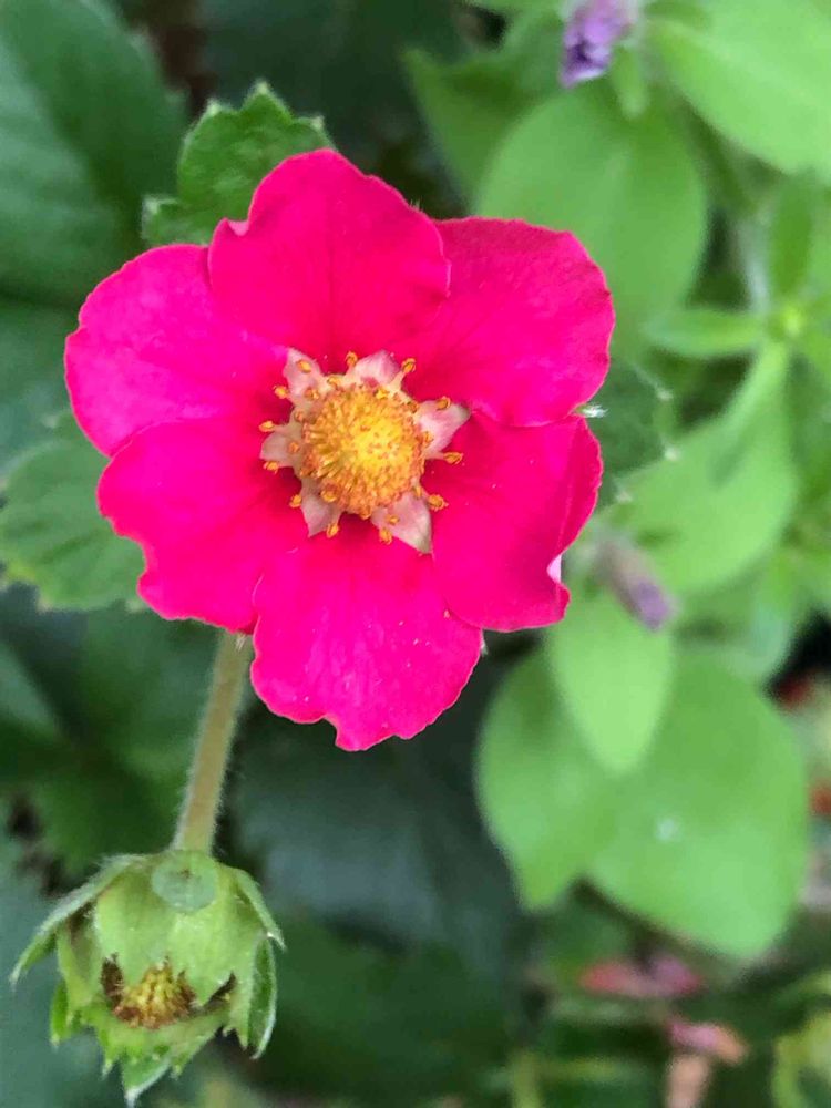 この暑い中、鉢の中で赤い花のいちごの花が頑張って咲いて居ましす。🤗 実も3歳の孫が赤くなるのを楽しみにして、「取っていい」と何度も聞きます‼️