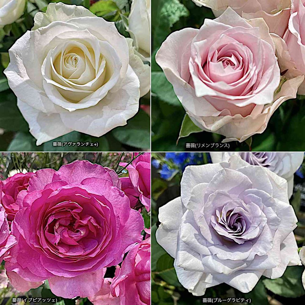 白系x1、ピンク系x2、青・紫系x1のバラ、4つ。