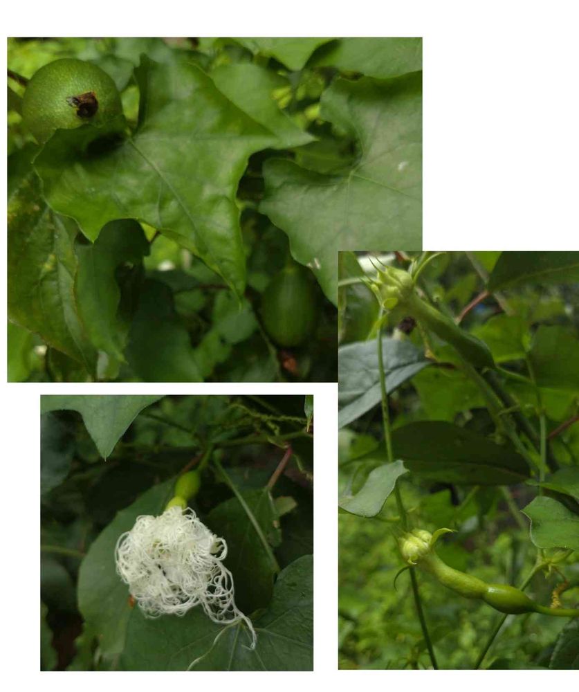 少し前に花を見つけたが、その後行ってもなかなか花を見つけられなかった。昨日やっと沢山の花を見つけ、じっくり全体を観察していると、もうかなり大きくなっている実も発見(左上写真)。