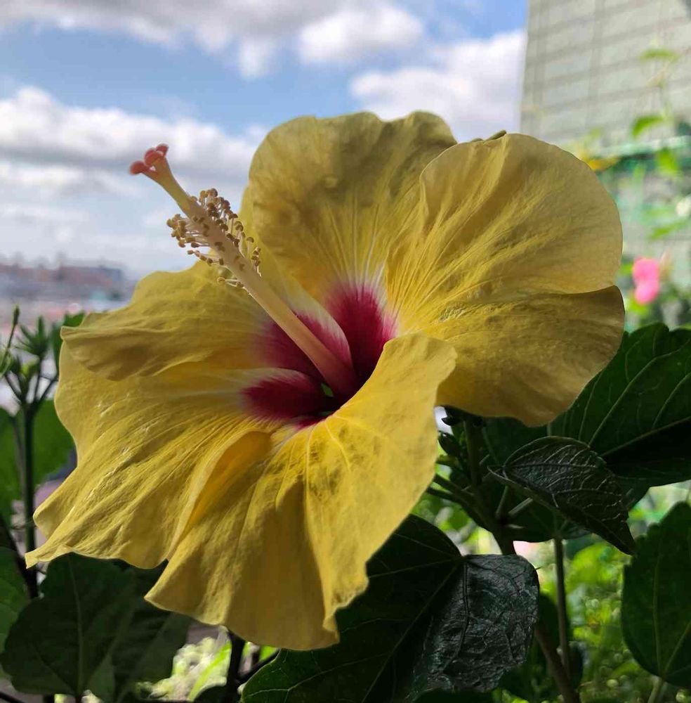 室内で冬越ししたハイビスカス アドニスイエローが咲きました。