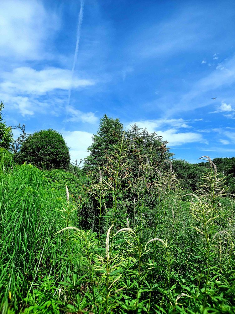 青空💙と白い雲☁️の下~好きな方向へ楽しそうに咲いていたクガイソウ🎶