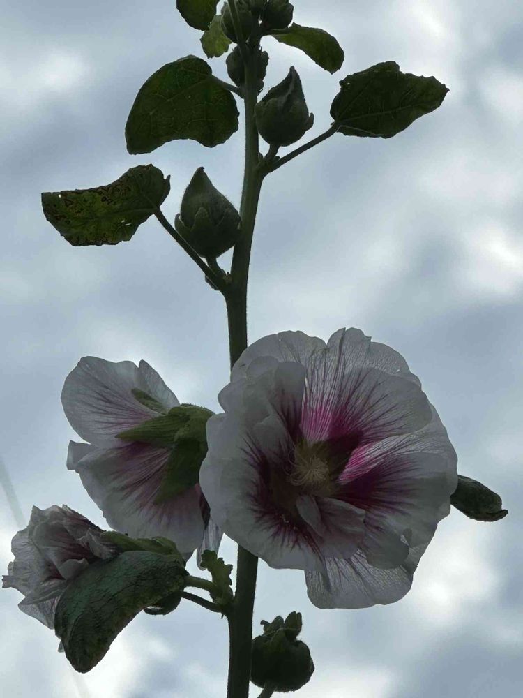 タチアオイがてっぺんまで咲いたら梅雨明けと言われていますが、あと蕾二つ分でしょうか。