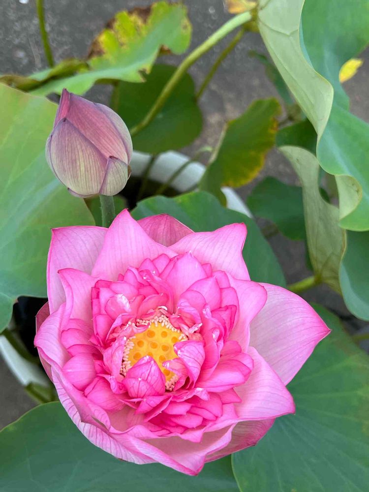昨年より花の直径が3㎝程小さめです。植え替えた時に、レンコンを3個にしたためなのか?分かりませんがこねた粘土土が少なかったのか?日照時間の関係なのか?なんとも言えませんが、咲いてくれて嬉しいです。