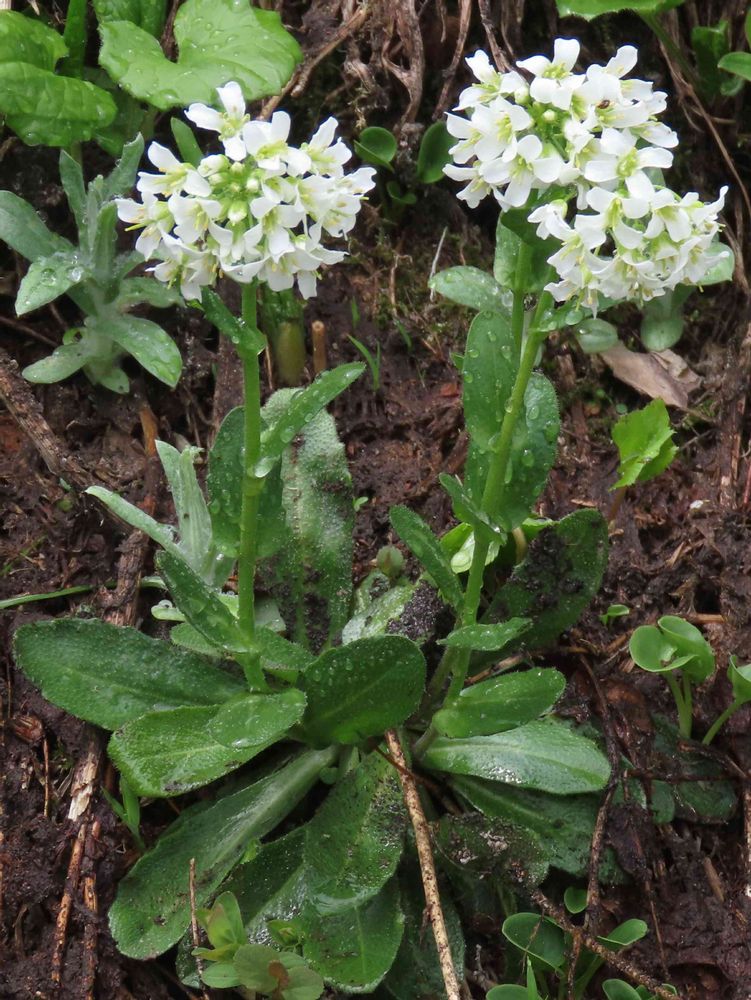 地面に張り付くようなロゼット状の根出葉のエゾノイワハタザオ。