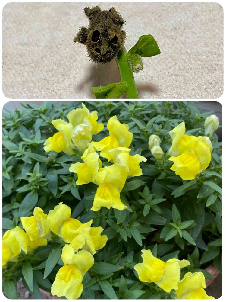 お話を聞くと、金魚草のドクロ💀との事で、我が家の金魚草も、花殻摘みを少しせずに花が咲き終わるのを待ってました。